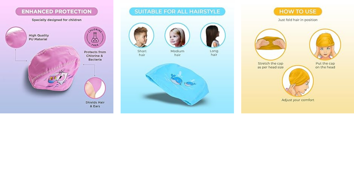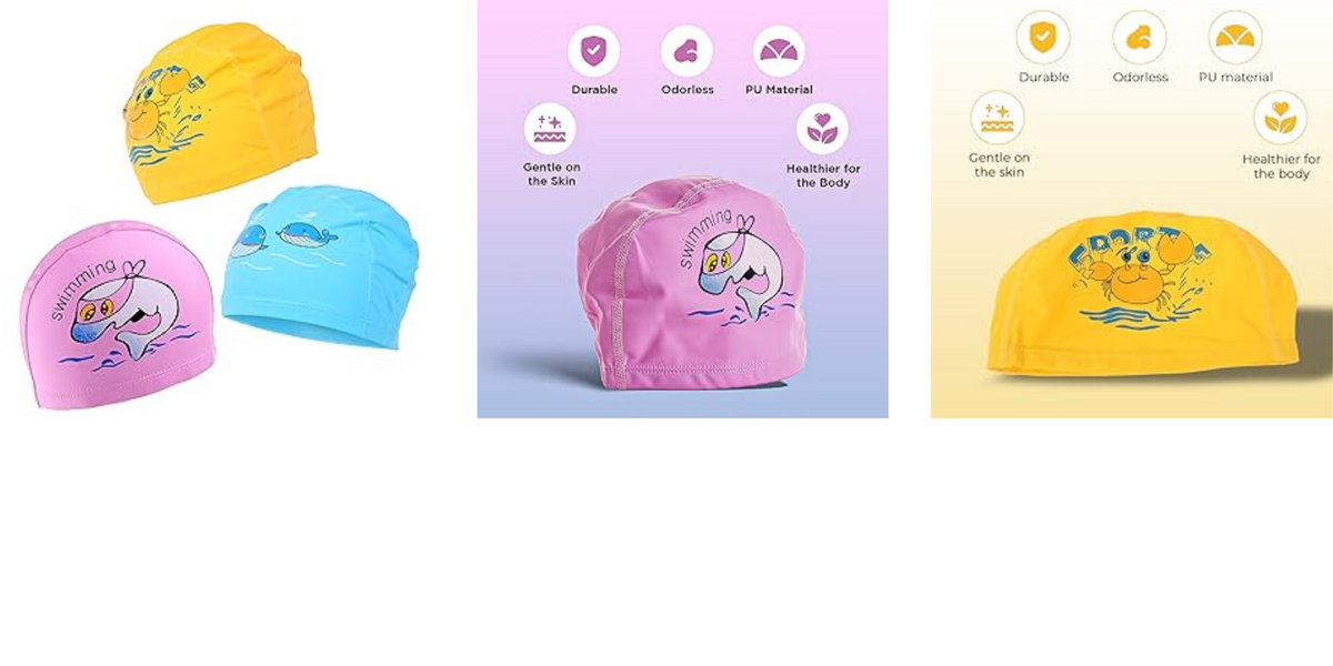 Fun Cartoon Designs with Vibrant Colors: The swim caps come in bright and kid-friendly colors like blue, pink, yellow with adorable cartoon designs. These fun designs encourage kids to enjoy swimming time more and match perfectly with their swimwear.