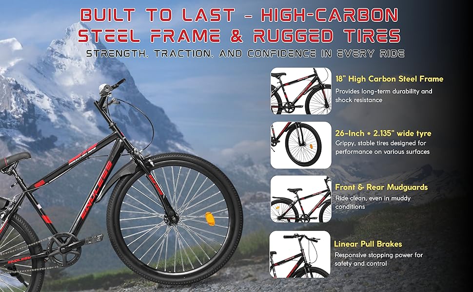 • عجلات مقاس 26 بوصة لجميع التضاريس: مزودة بإطارات متينة لتوفير ثبات وأداء ممتازين على المسارات أو الطرق المرصوفة بالحصى أو المعبدة