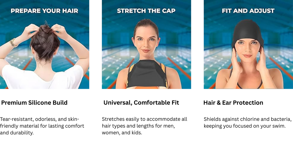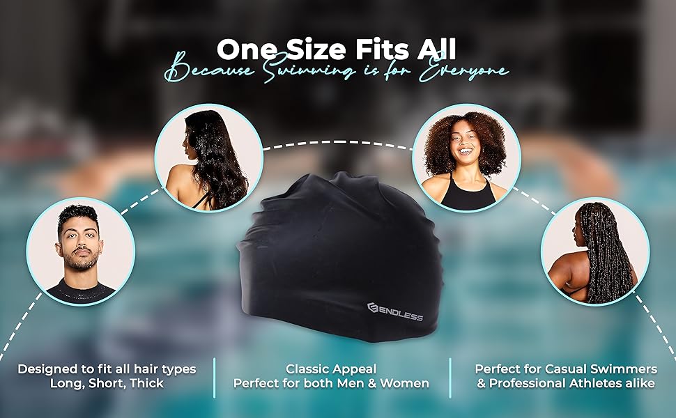 EASY FIT: Designed for hassle-free use, this swim cap easily stretches to fit a variety of hair lengths, including long, short, and thick hair. Its universal fit ensures it fits men, women, and kids.