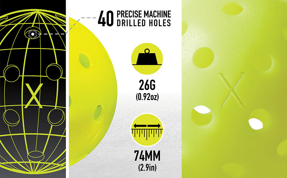 - PRECISION DESIGN: X-40 pickleballs are constructed with 40 precise, machine-drilled holes for a balanced flight pattern and tight, reliable spin that is consistent from ball to ball