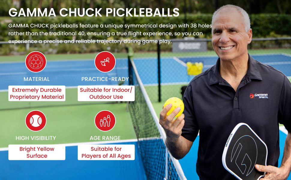 - SYMMETRICAL 38-HOLE PATTERN: GAMMA CHUCK outdoor pickleball balls set themselves apart with a unique symmetrical design featuring 38 holes, ensuring a true flight experience, providing players with a precise and reliable trajectory during game play.