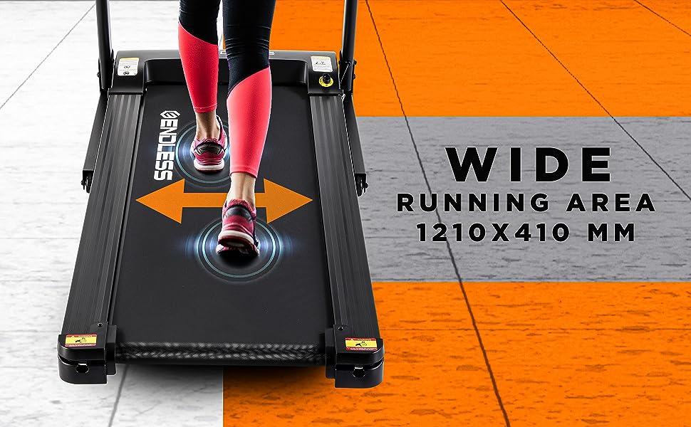 Endless Elite جهاز جري منزلي قابل للطي مع ميل يدوي، محرك تيار مستمر 4 حصان، أقصى وزن للمستخدم 110 كجم، أقصى سرعة 14 كم/ساعة، مساحة تمرين 410 مم مع مكبرات صوت مدمجة من أندلس