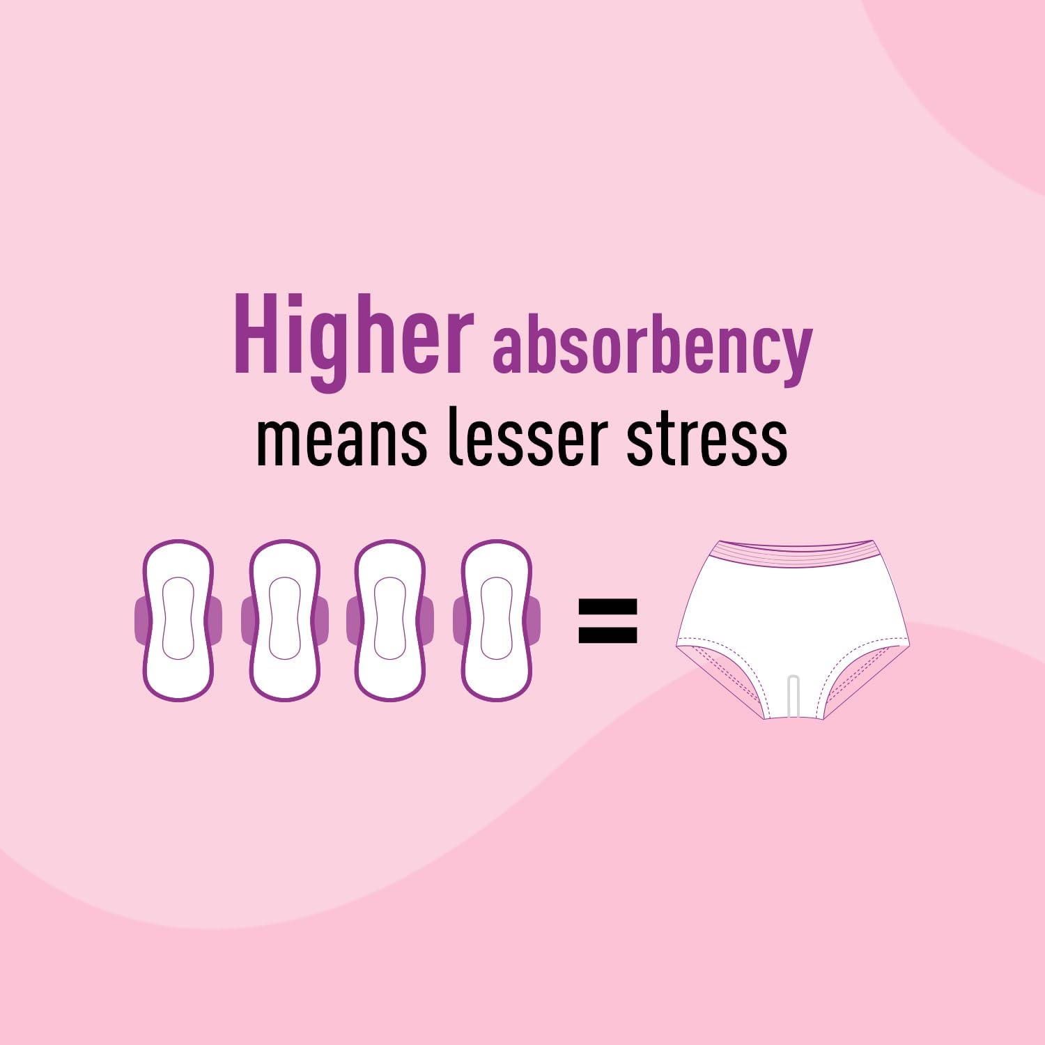 - توفر امتصاصًا للسوائل يزيد أربع مرات عن الفوط العادية بفضل حبيبات دقيقة فائقة الامتصاص.