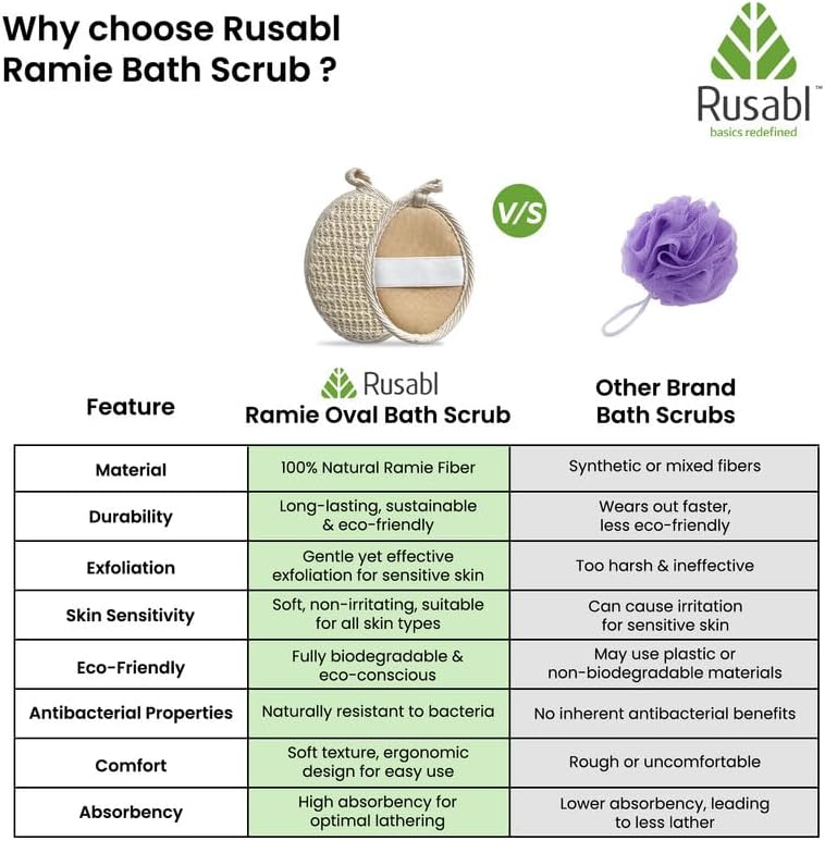 - تألق طبيعي، لا حاجة إلى فلتر – لوفة الاستحمام Rusabl مصنوعة من ألياف الرامي الطبيعية 100٪، المختارة بعناية من أجود أنواع ألياف الرامي. إنها هدية الطبيعة لبشرتك، لا حاجة إلى تعديلات.