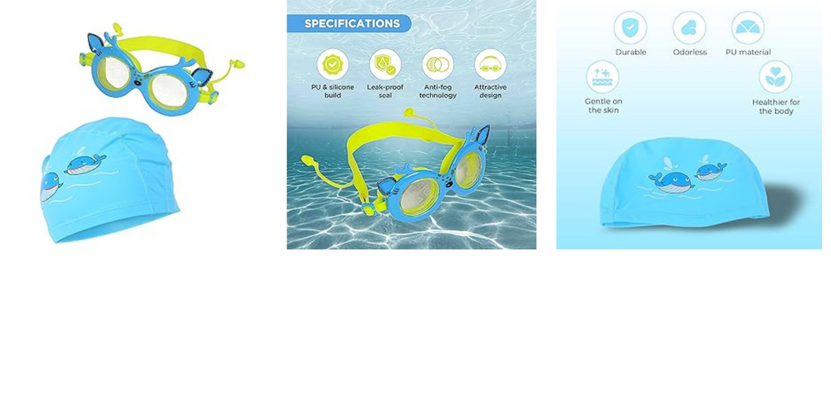 طقم سباحة كامل للأطفال: يشمل نظارات سباحة قابلة للتعديل مع حماية من الضباب والأشعة فوق البنفسجية، وغطاء سباحة ناعم من السيليكون لملاءمة مريحة ومريحة.