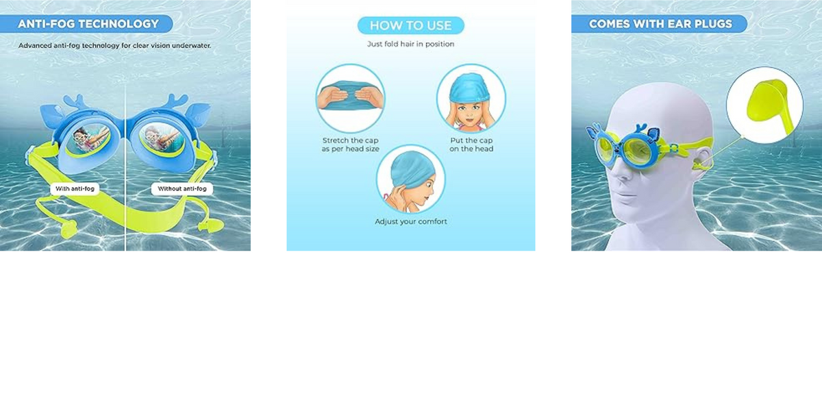 مقاومة للتسرب والحماية من الماء: توفر كل من النظارات الواقية وغطاء السباحة مانعًا للتسرب لمنع تسرب المياه، بينما يساعد الغطاء أيضًا على الحماية من البكتيريا المنقولة بالماء، مما يجعلها أكثر أمانًا للأطفال في أحواض السباحة والمياه المفتوحة.