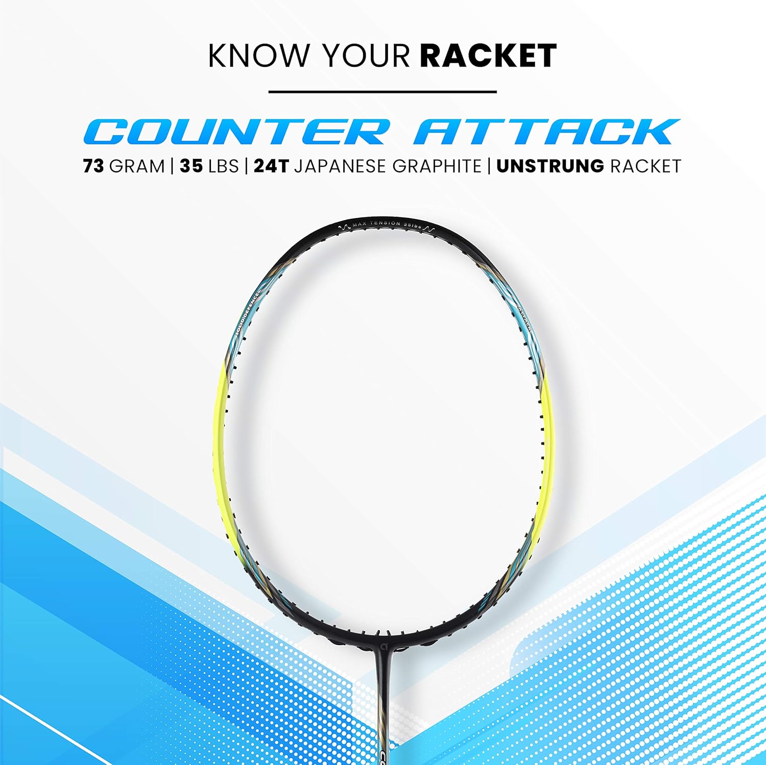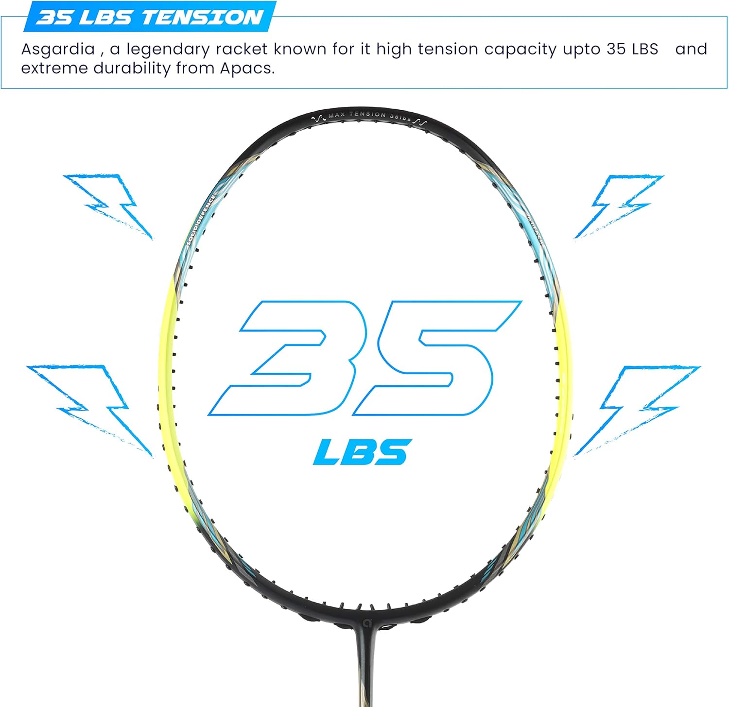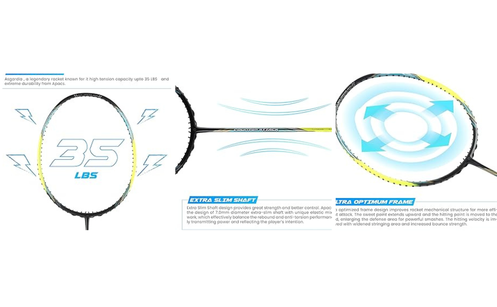 •  35 رطل من الشد: Counter Attack، مضرب أسطوري معروف بقدرته العالية على الشد التي تصل إلى 35 رطلاً ومتانته الفائقة من Apacs.