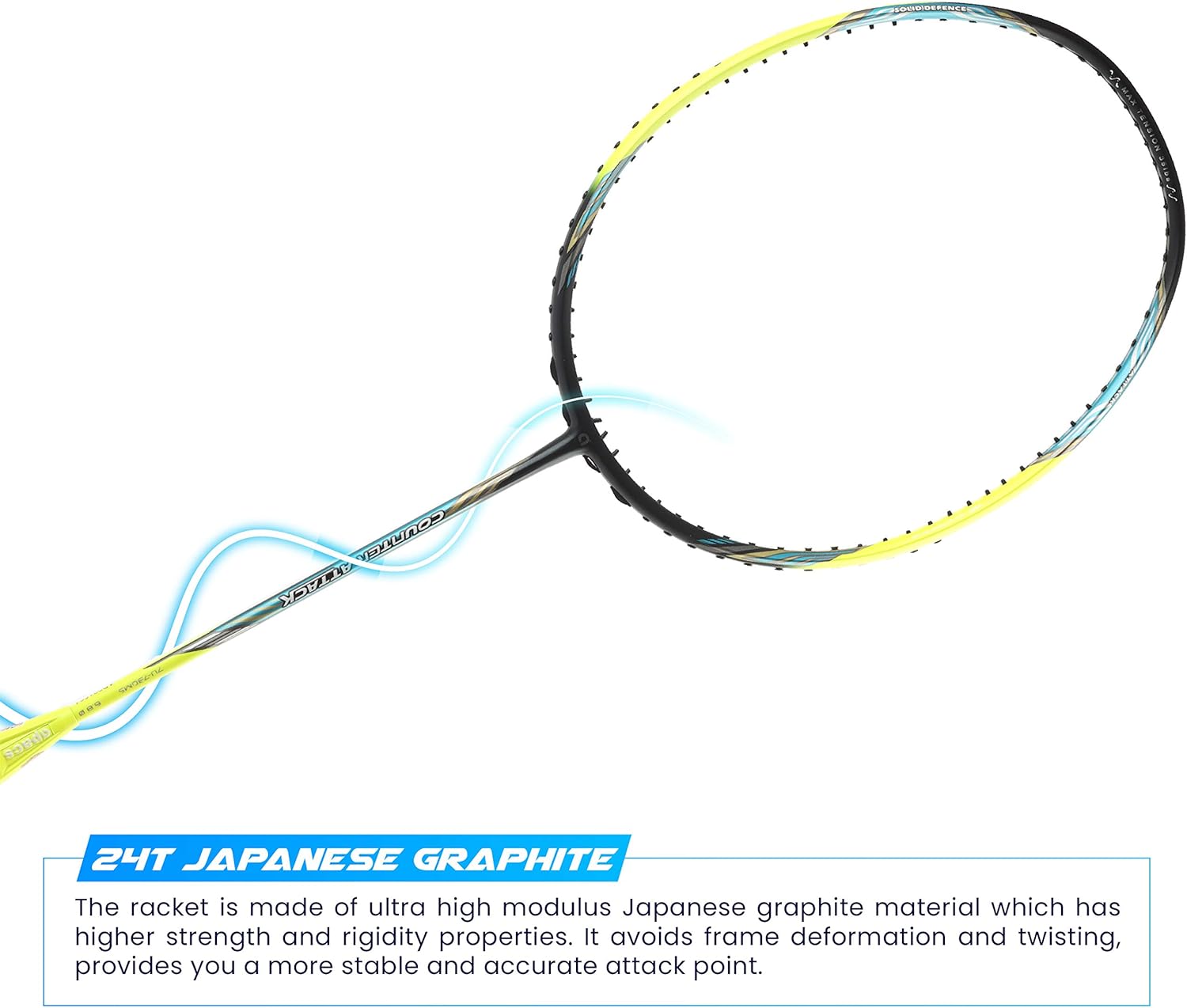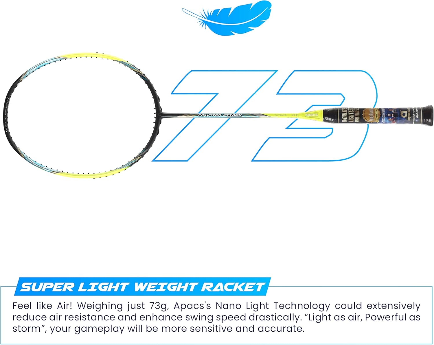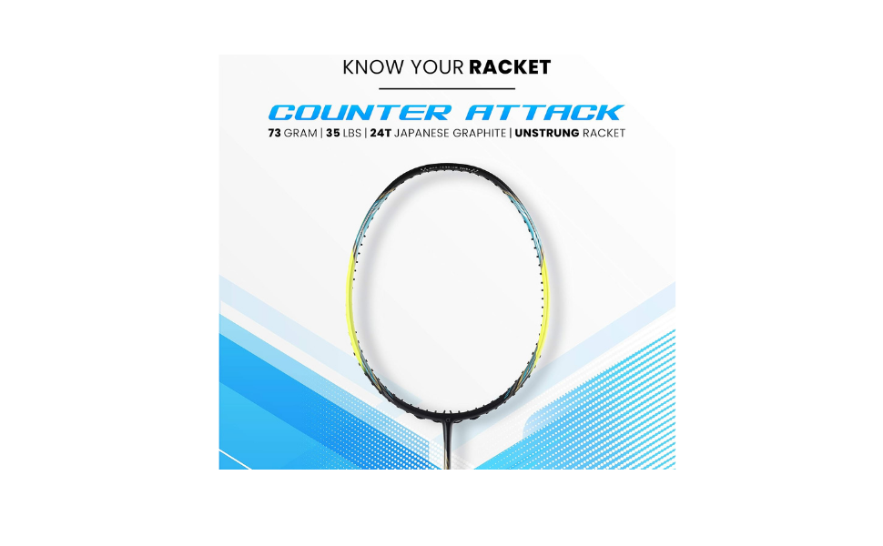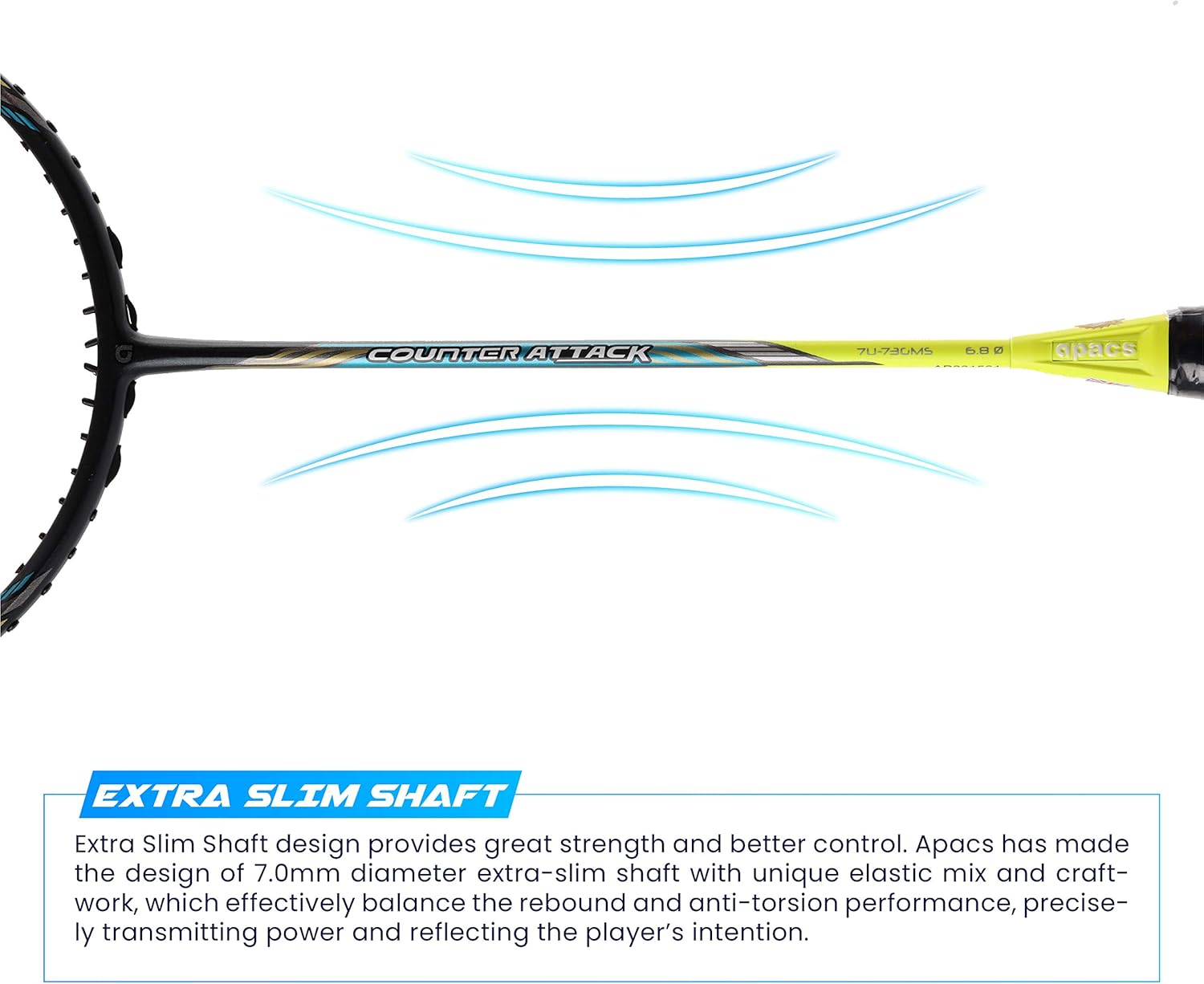 •  35 رطل من الشد: Counter Attack، مضرب أسطوري معروف بقدرته العالية على الشد التي تصل إلى 35 رطلاً ومتانته الفائقة من Apacs.