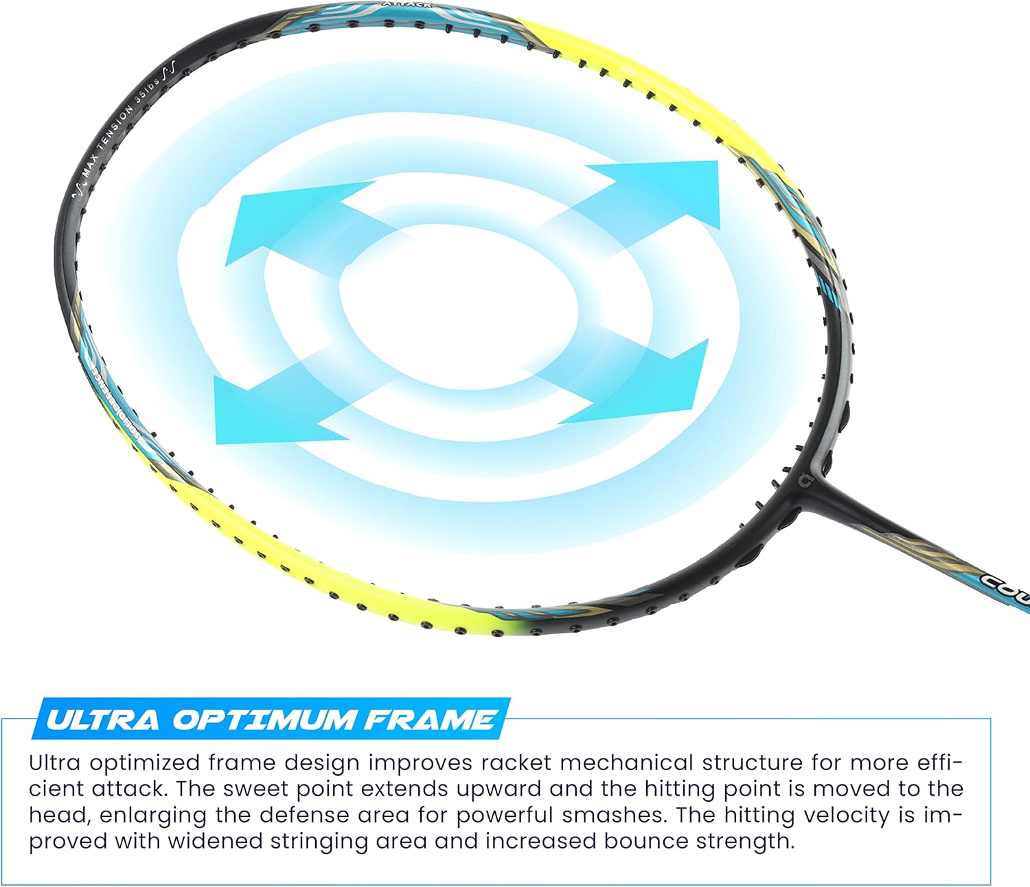 •  إطار ULTRA OPTIMUM: تصميم الإطار المُحسّن للغاية يحسّن الهيكل الميكانيكي للمضرب من أجل هجوم أكثر كفاءة. تمتد النقطة المثالية للأعلى ويتم نقل نقطة الضرب إلى الرأس، مما يوسع منطقة الدفاع من أجل ضربات قوية. تم تحسين سرعة الضرب من خلال توسيع منطقة التوتير وزيادة قوة الارتداد.