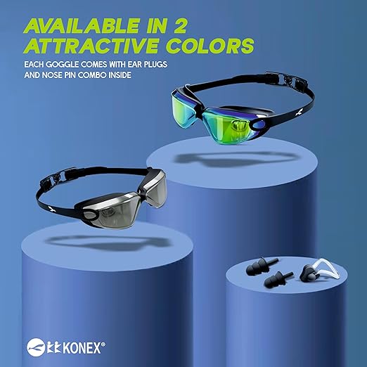 نظارات سباحة KONEX المضادة للضباب عالية الجودة للرجال والنساء مع حماية من الأشعة فوق البنفسجية | تأتي مع سدادات أذن ودبوس أنف | مثالية للأطفال والكبار