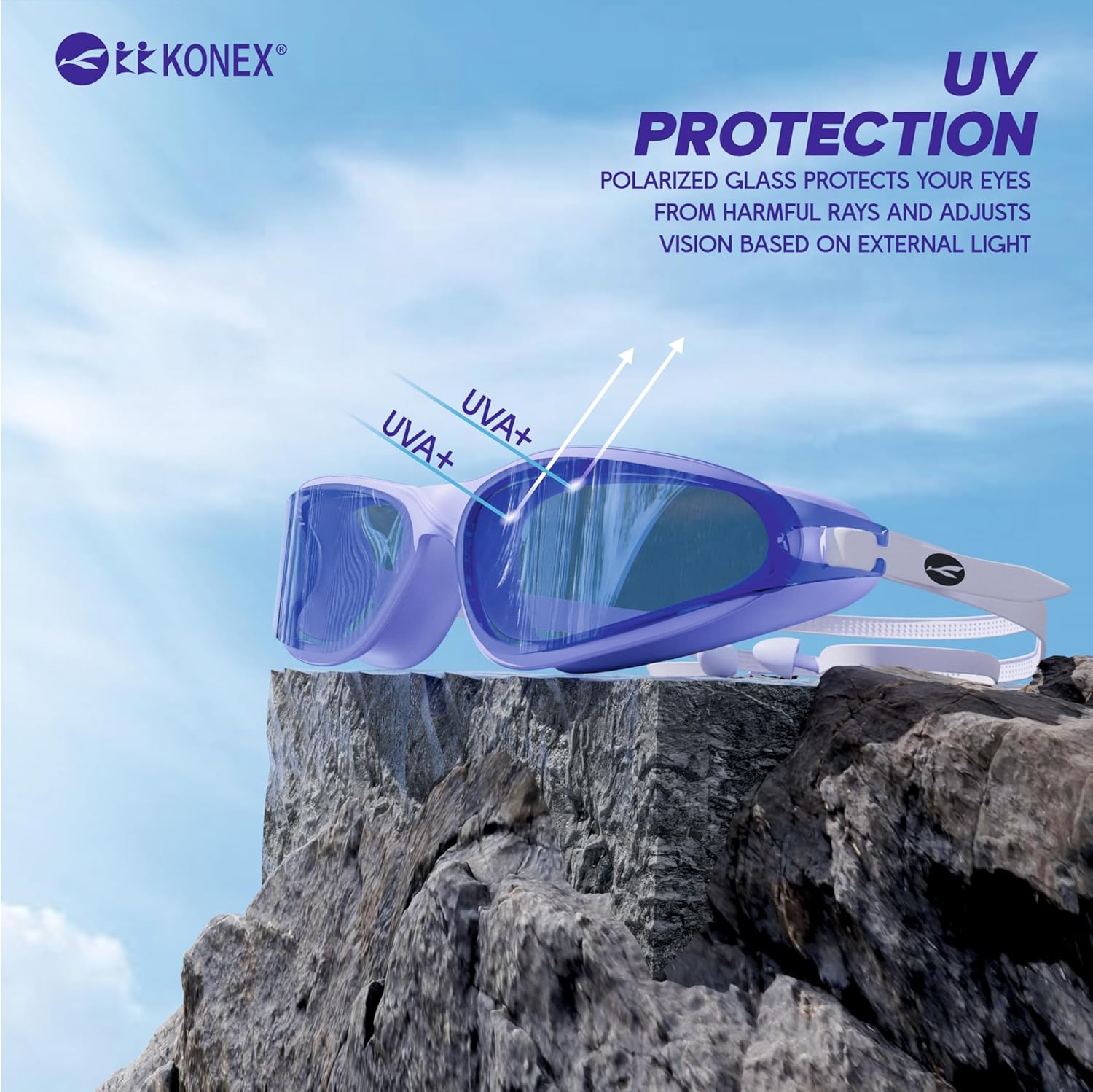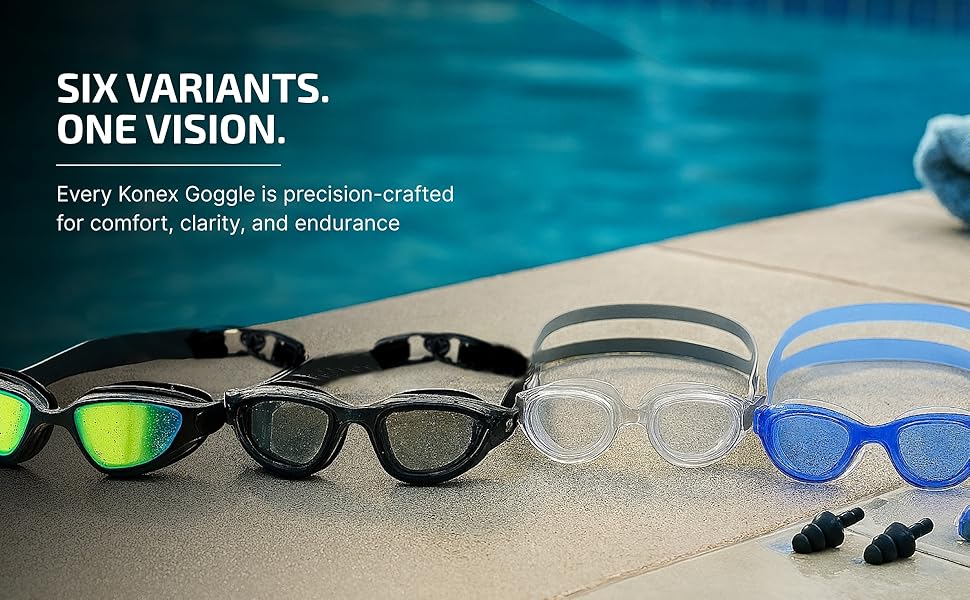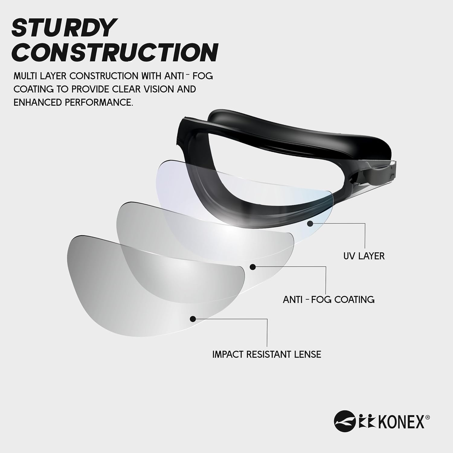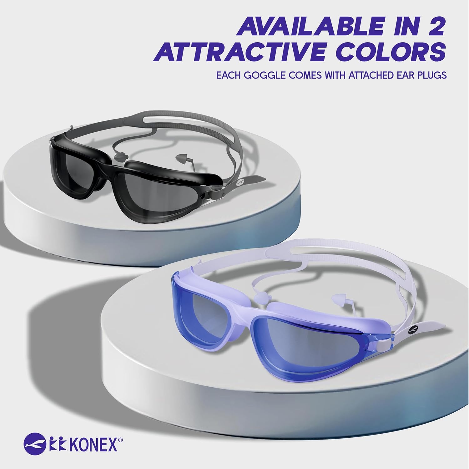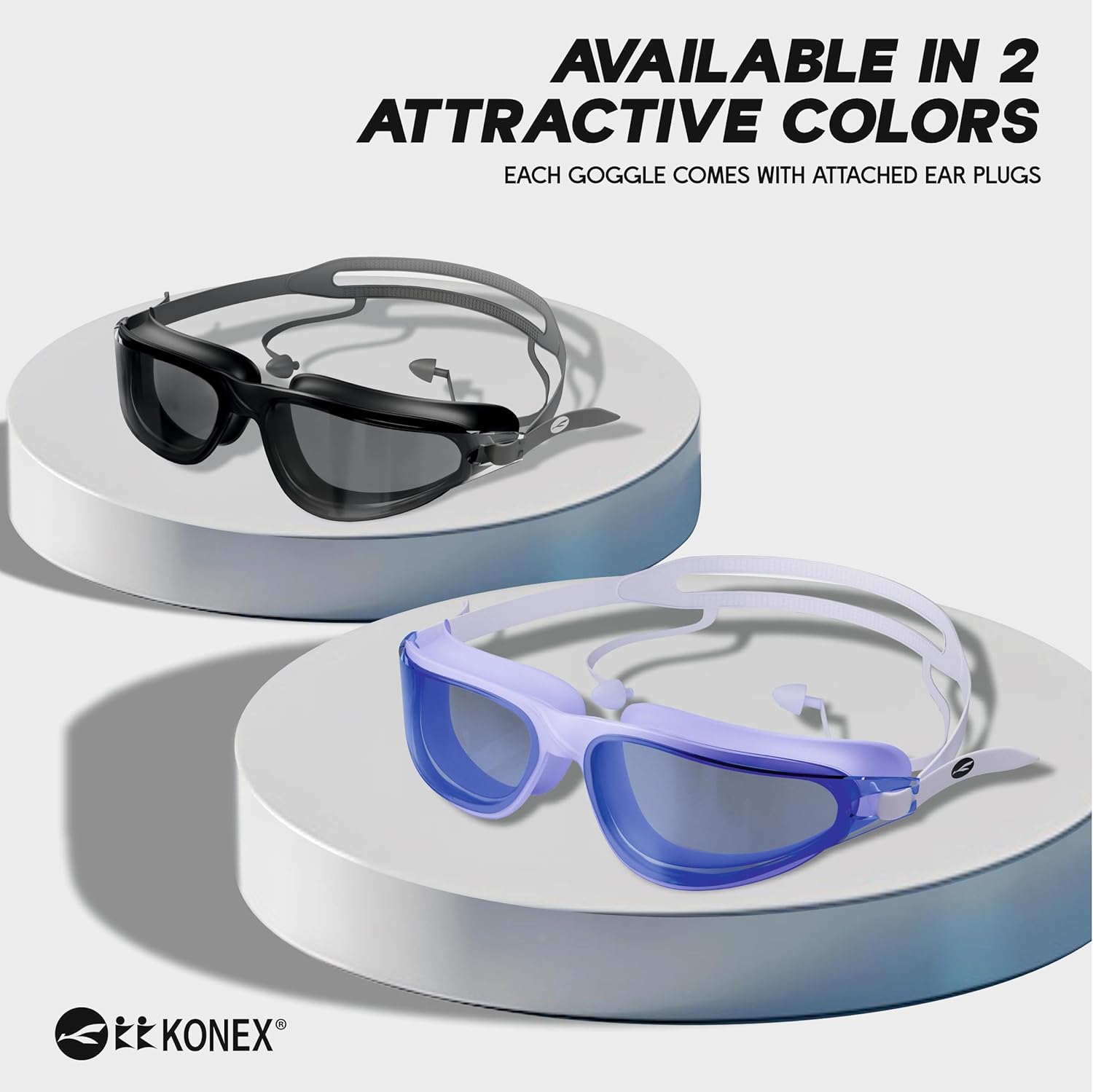 نظارات سباحة KONEX المضادة للضباب مع حماية من الأشعة فوق البنفسجية للرجال والنساء | رؤية واسعة الزاوية مع تقنية مانعة للتسرب | تأتي مع سدادات أذن مرفقة | مثالية للأطفال والكبار