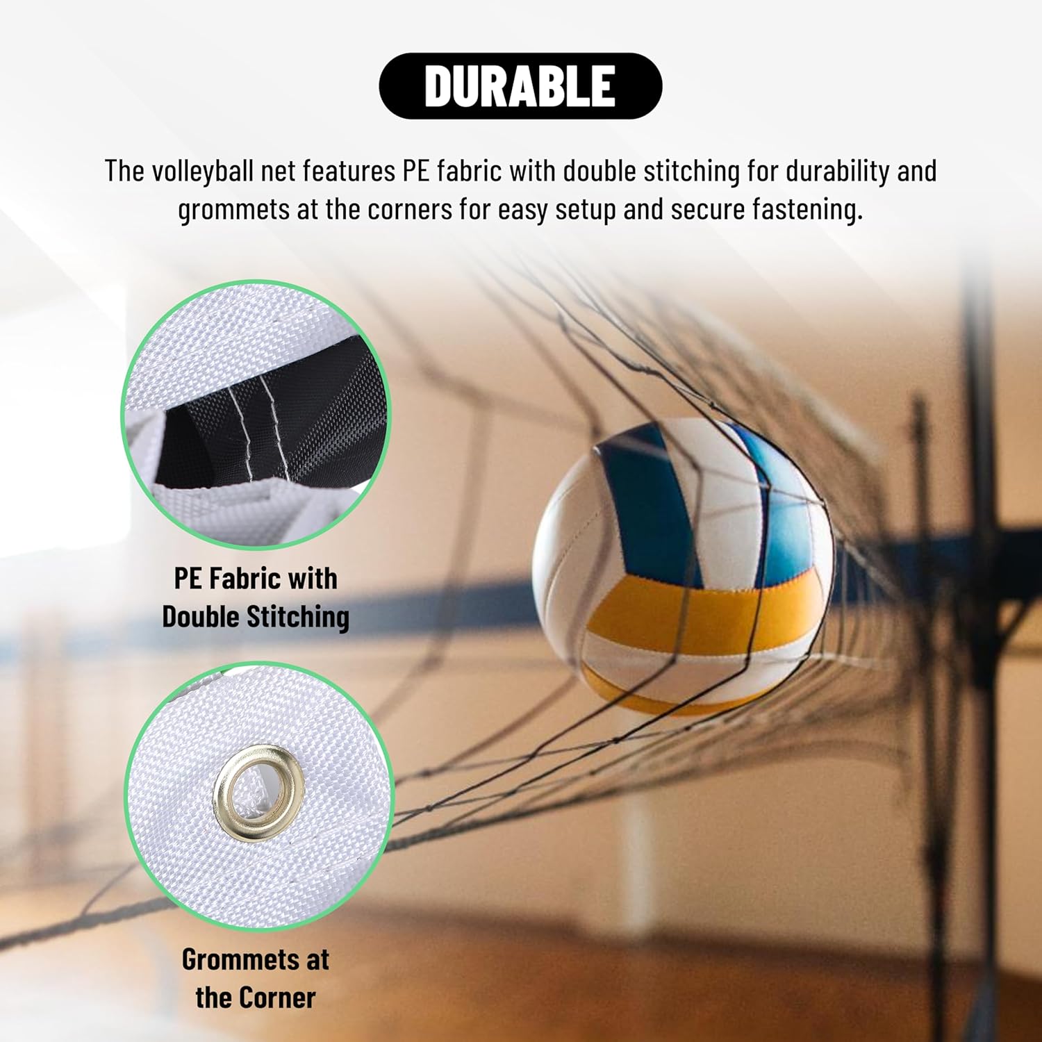 متينة: الجوانب الأربعة لشبكة الكرة الطائرة مغطاة بنسيج PE، خياطة مزدوجة، جذابة ومتينة. توجد حلقات في أربع زوايا لشبكة الكرة الطائرة، يسهل سحبها بشكل مستقيم وتثبيتها.
