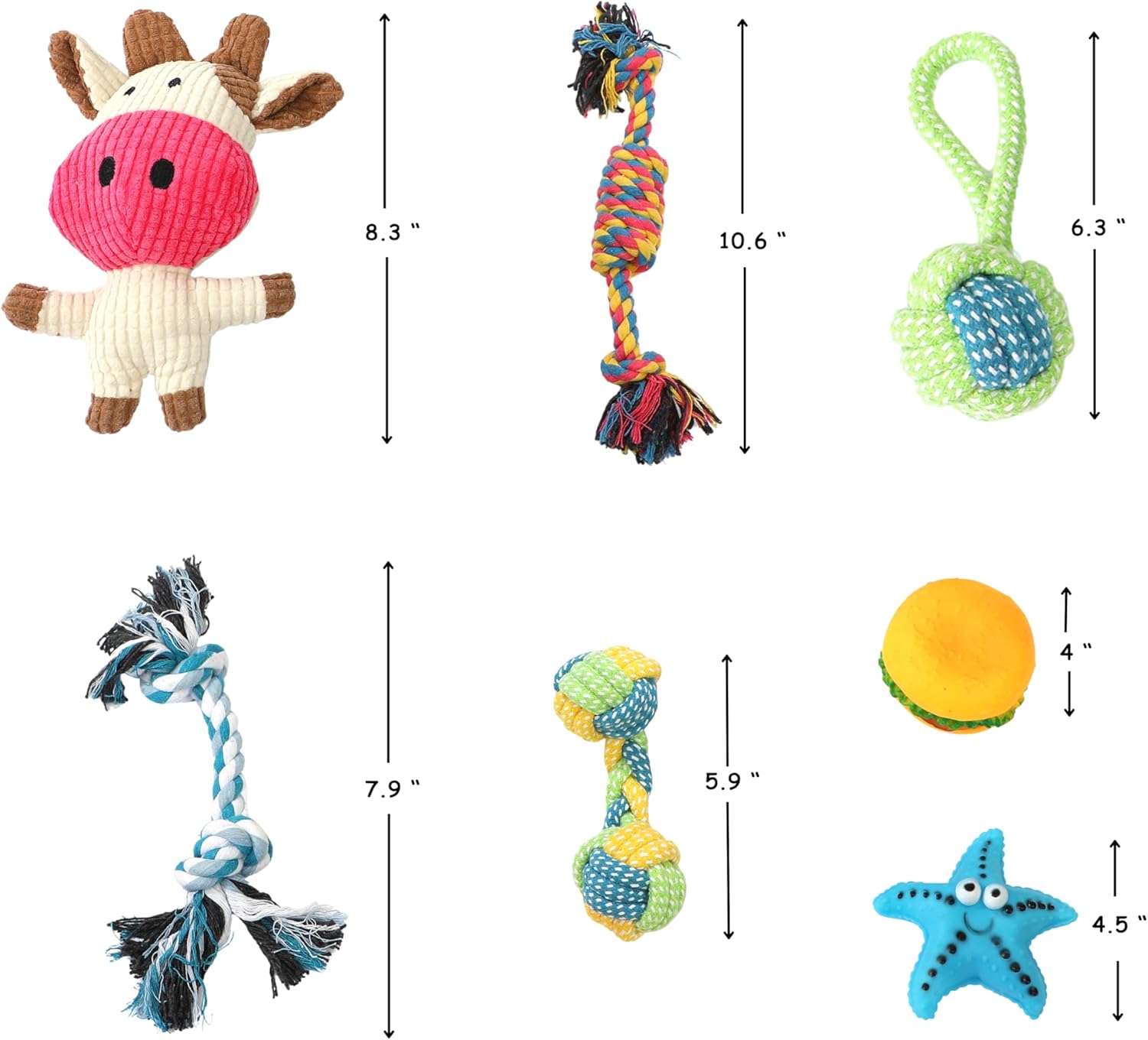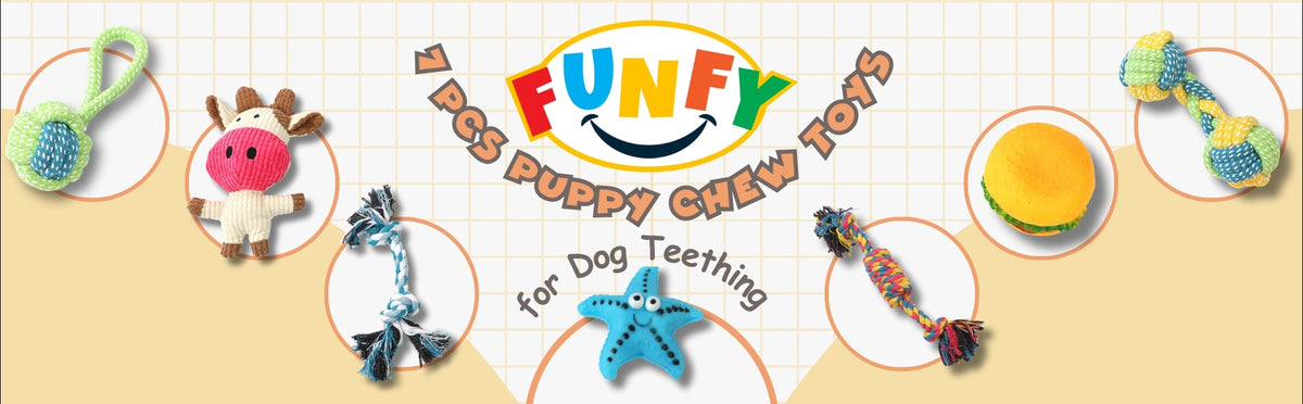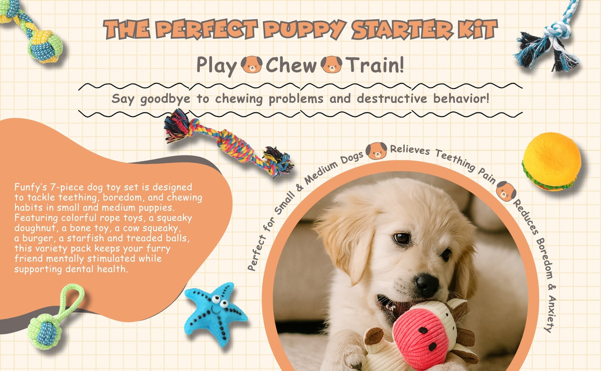 Funfy مجموعة من 7 ألعاب مضغ للجراء للكلاب التي تمر بمرحلة التسنين | ألعاب مضغ للكلاب مع ألعاب حبلية، وحبال كروية متعددة، ولعبة على شكل نجمة، ولعبة برجر، وألعاب صرير للكلاب الصغيرة والمتوسطة