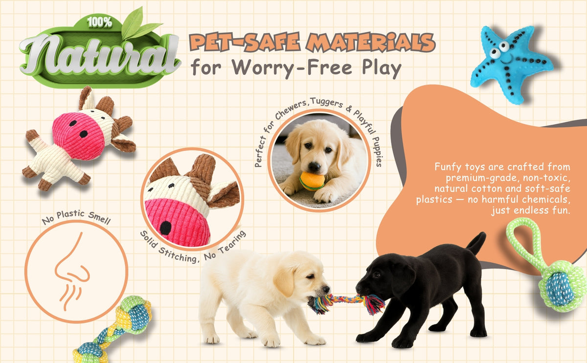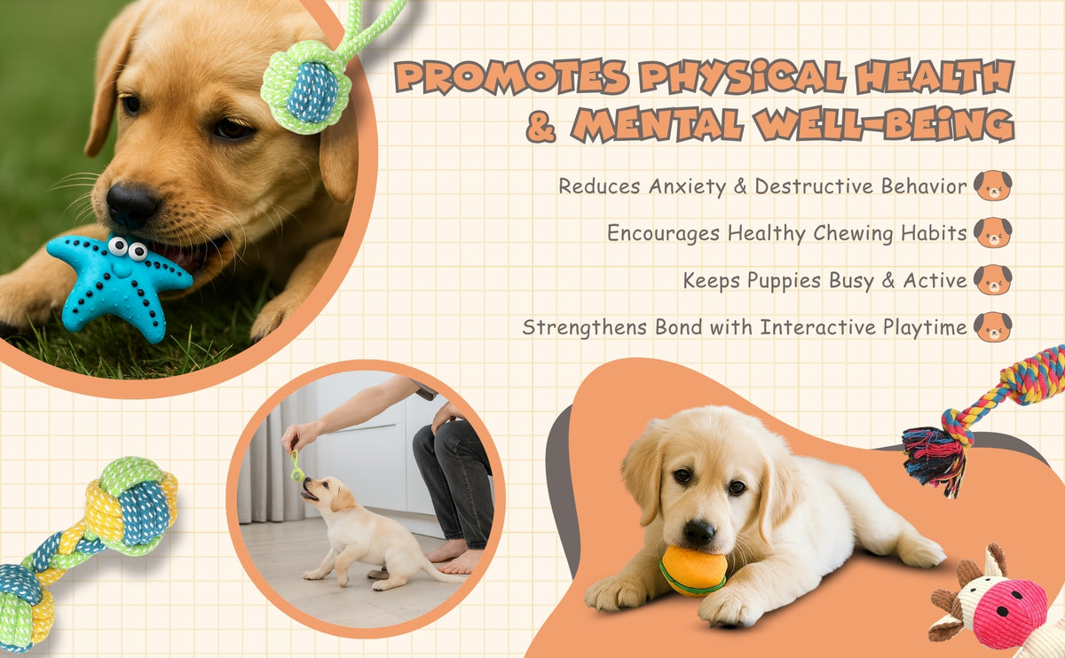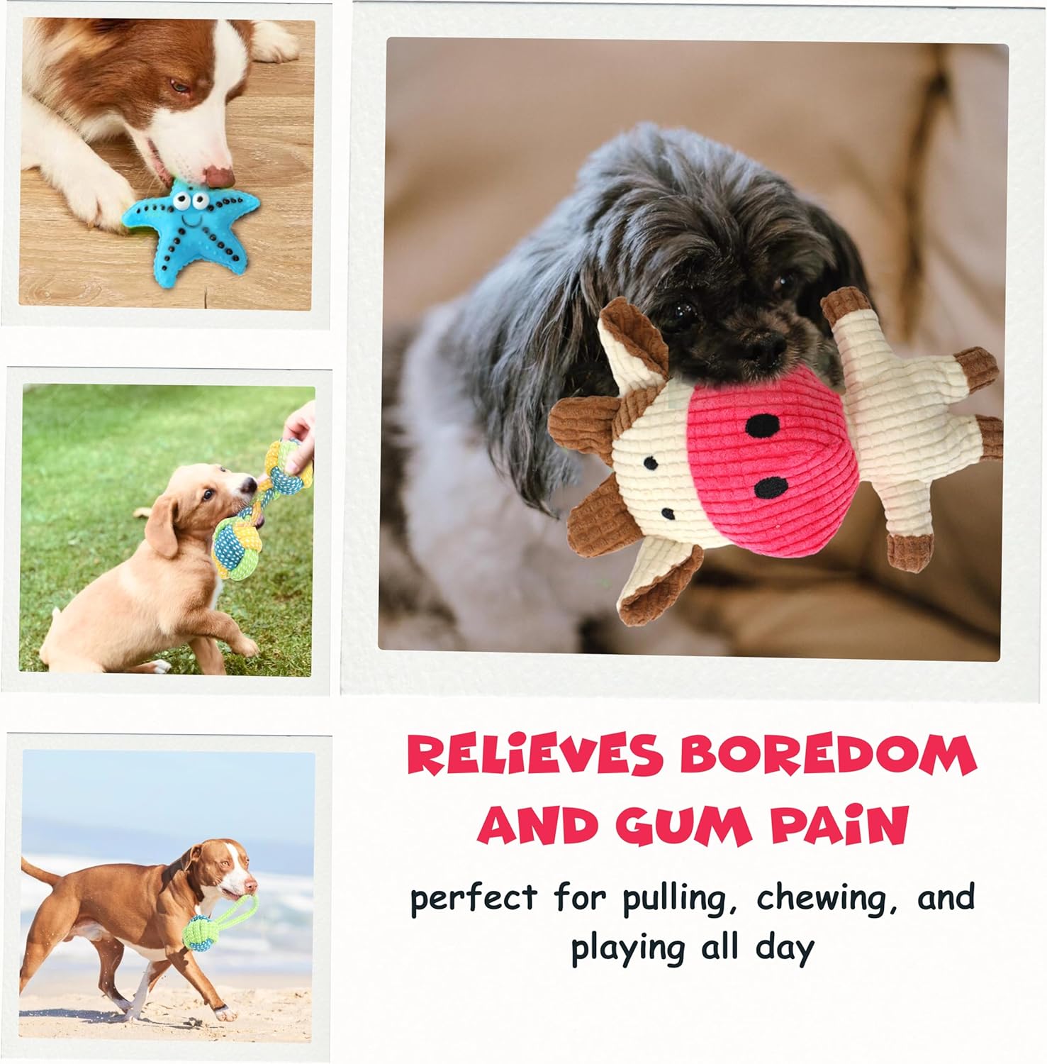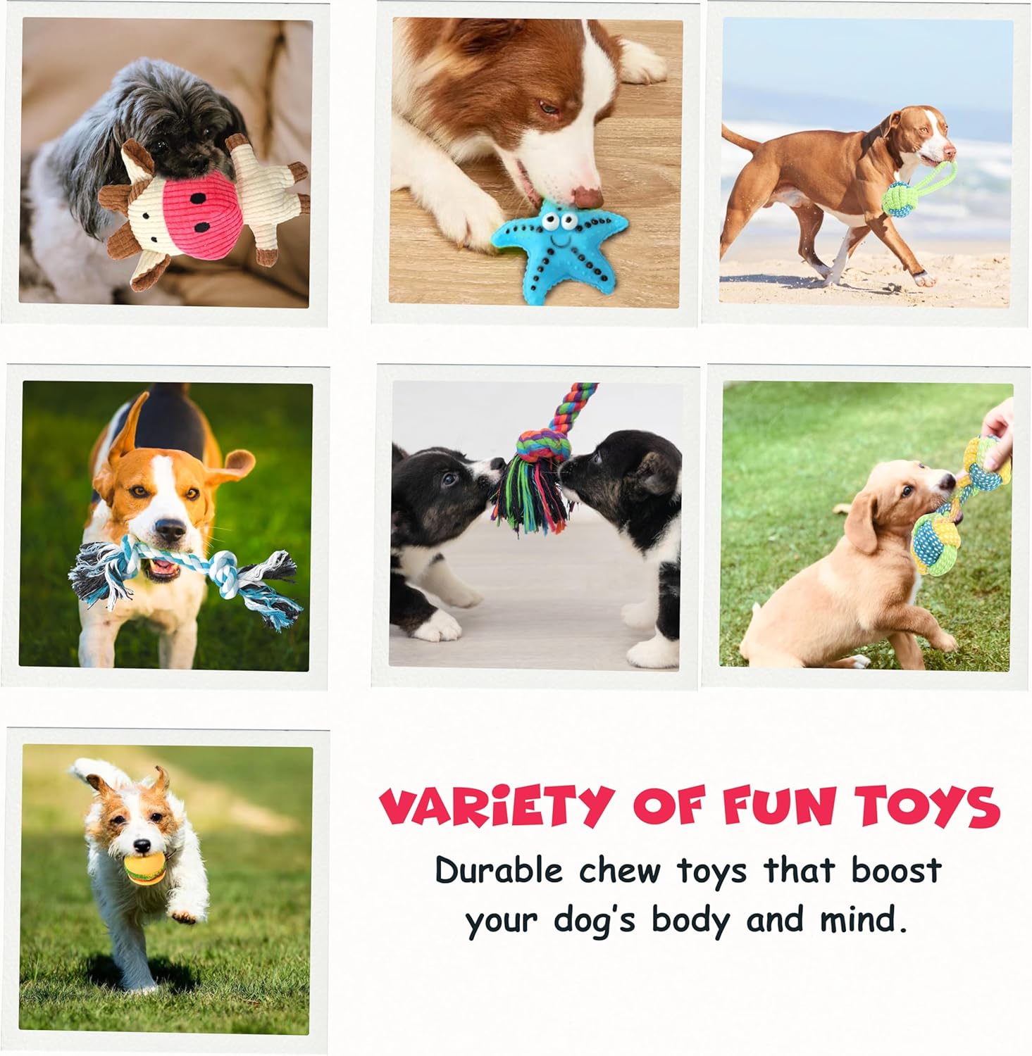 - مجموعة متنوعة من الألعاب الممتعة: تتضمن ألعابًا تُصدر صريرًا (مثل الدونات والعظام والأبقار) وألعاب مضغ متينة تُعزز صحة كلبك الجسدية والنفسية.
